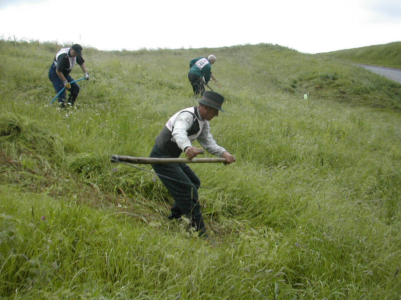 | Mowing competition The association for tradtional rural landscapes initiated and organised the River Valley World Championship mowing contest in the Rekijokilaakso river valley in 2004. We observed and used the format of the mowing contest in Norway Hjartdalen. The contest was a joint effort between our association, Southeast Somero village association, "Landscape Train" -management project and Interreg IIIA -project "Traditional cultures meet". This resulted in a good mixture of hands-on work, ecology, practical management and traditional culture, competitions, pulling the rope, dancing etc. A strong group of Estonians participated in the mowing and cultural happenings. |